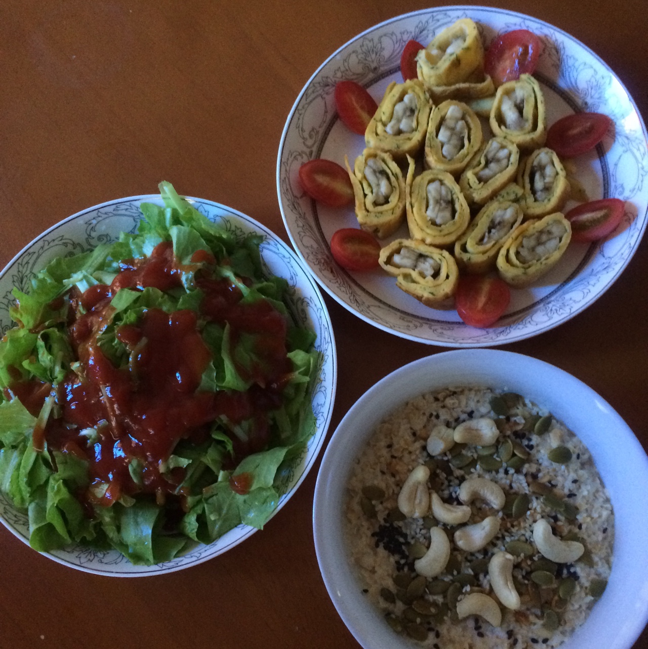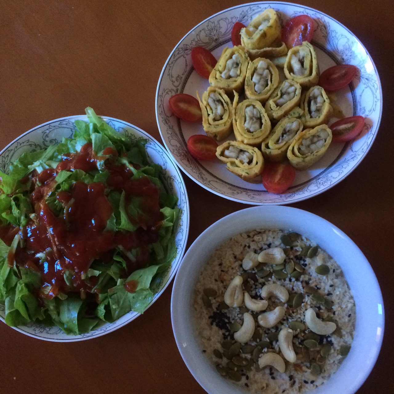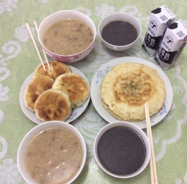 饼配小米,绿豆粥,再加一碗必不可少的多豆,多米糊,吃早饭咯