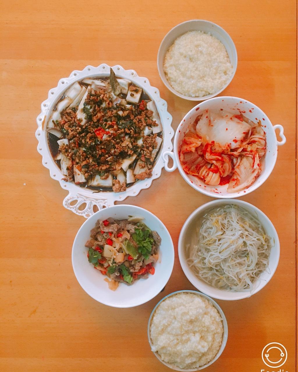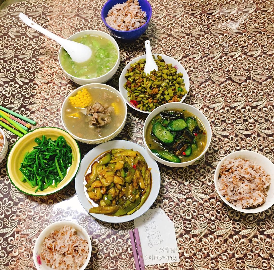 午餐:酸豆角肉末、排骨玉米汤、黄瓜鳝鱼+炒茄子、青菜、丝瓜+红米饭
