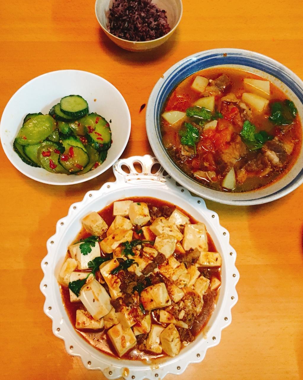 二人食:番茄炖牛腩+麻婆豆腐+剁椒黄瓜和杂粮饭