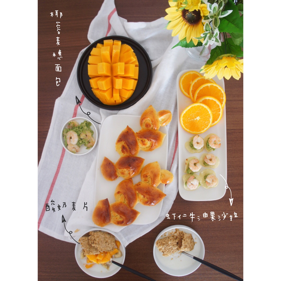 依旧酸奶加麦片,昨晚出炉的椰蓉麦穗面包,牛油果虾仁沙拉,用薯片做底,袋装的乐事好薄好小一块😂 #午餐•2016年...