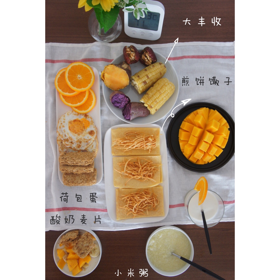 早上酸奶麦片,小米粥,粗粮开会,煎饼卷馓子是我吃的,还有水...