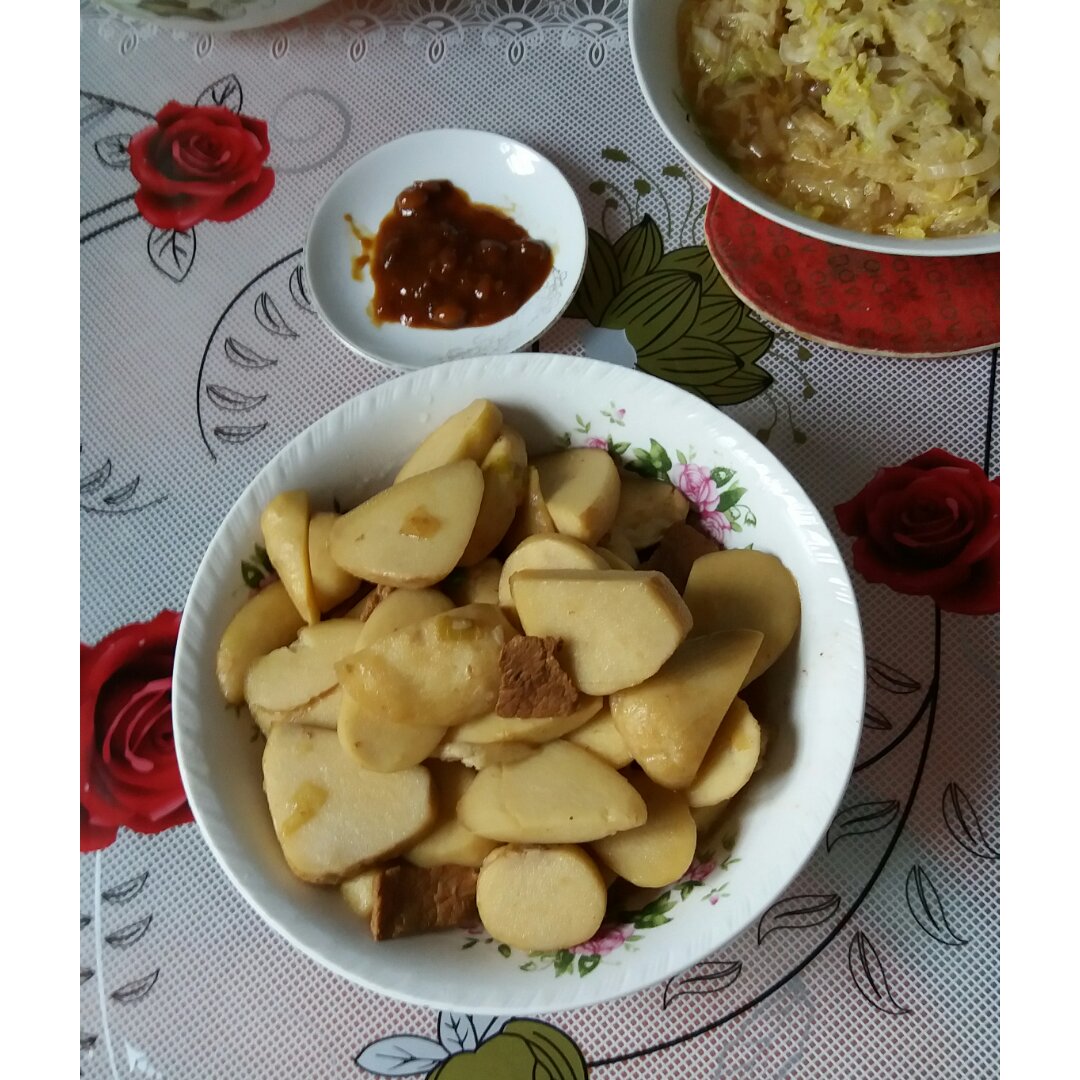 芋头炒肉,海米炖白菜,莴苣叶子黄豆酱。吃自家做的馒头还有舅舅带...