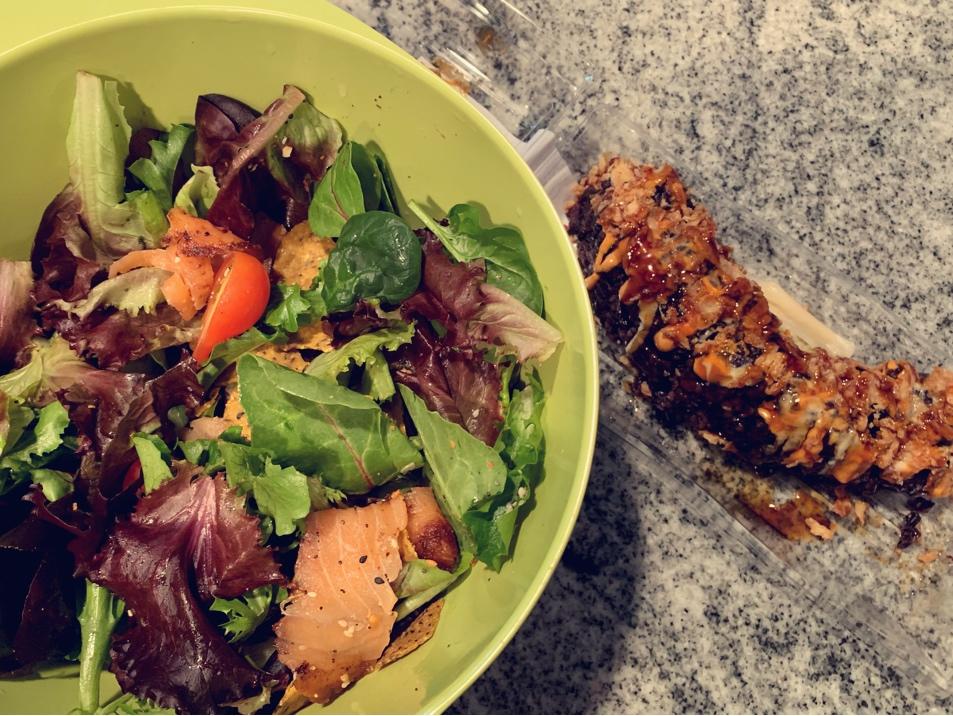 偷懒买来的寿司🍣,简单的油醋汁腌熏三文鱼沙拉🥗,一杯高颜值的下午茶甜点,柠檬🍋气泡水配电脑,一首安静柔缓的歌...
