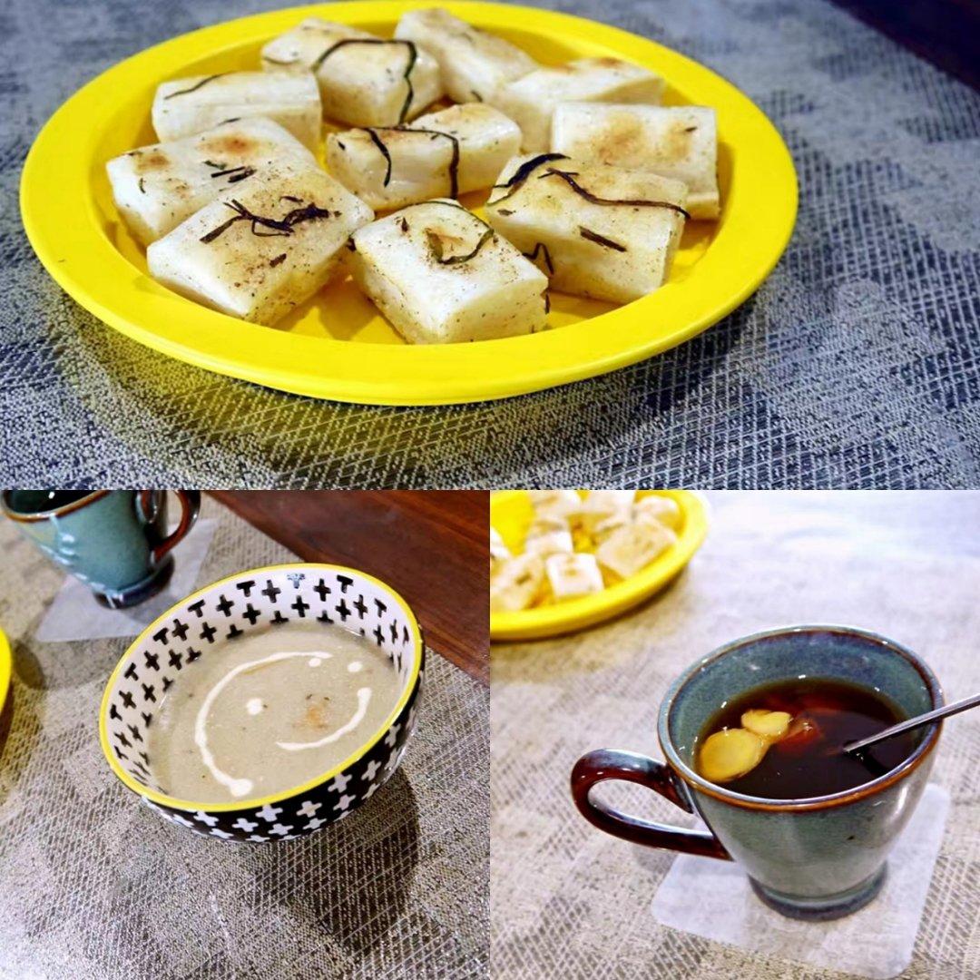孜然香葱煎宁波年糕,洋葱蘑菇忌廉汤,黑糖姜枣茶