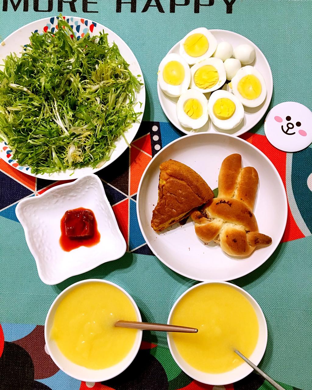 2018年1月13日,周六,你好!早上忘记发啦,今日早餐:凉拌苦菊,煮鸡蛋+鹌鹑蛋,豆腐乳,南瓜戚风蛋糕+小...