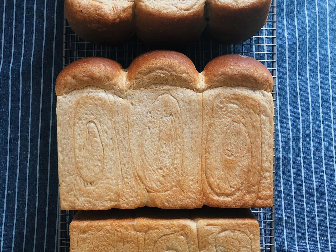 目前为止最满意的全麦吐司。提前一宿冷藏水解全麦面粉。上下火200°C25分钟,180°C20分钟