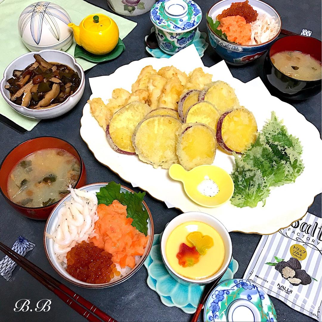 今天煮了柠檬地瓜。一个地瓜太大、剩下的炸了天妇罗。结果越炸越多、又炸了鸡柳和紫苏。蘸松露盐吃...