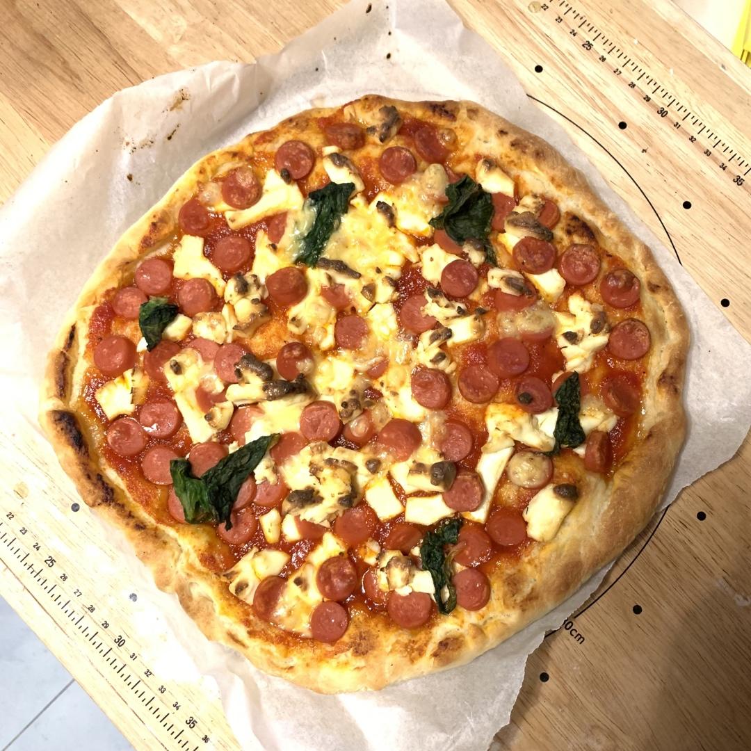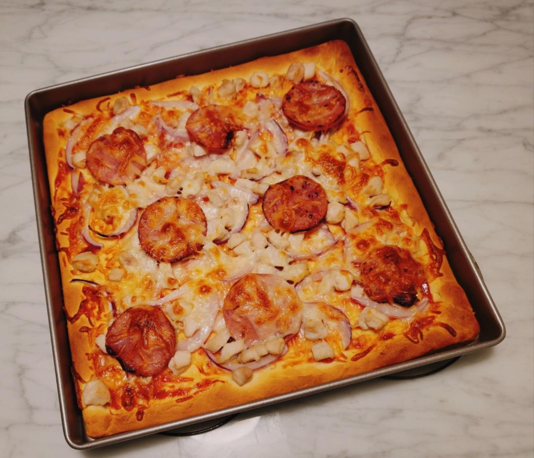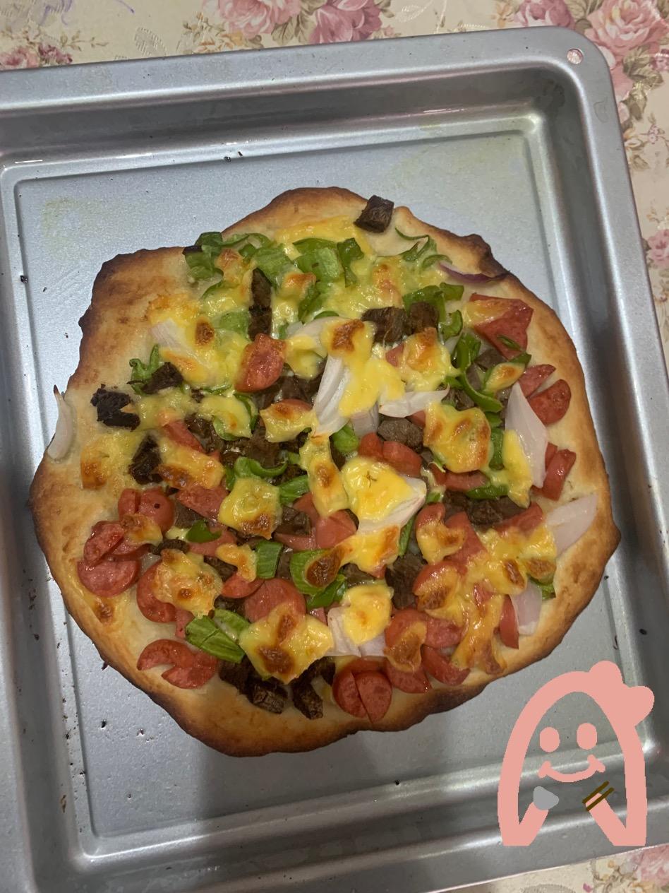 第一次做,还挺好吃的。比外面披萨店的料足多了。么有圆形烤盘,手动揉成圆形,将就一下吧,不影响口感。