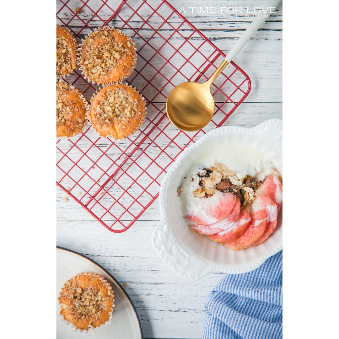 核桃海绵小蛋糕与蜜桃麦片酸奶