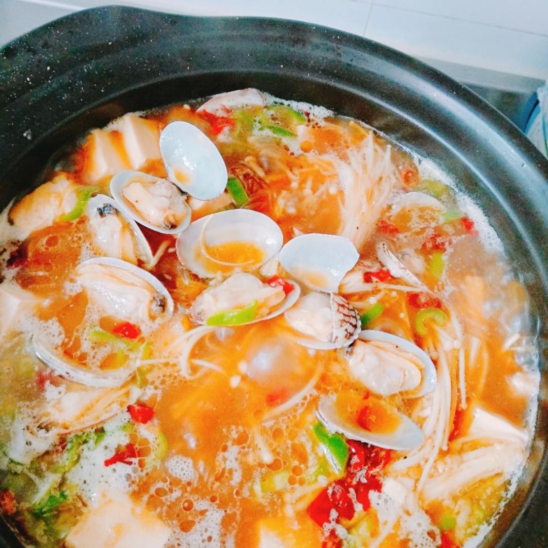 蒜蓉花蛤金针菇豆腐煲,味道很好,下饭极佳。汤也好喝。爱吃蒜蓉的可以试试。😃
