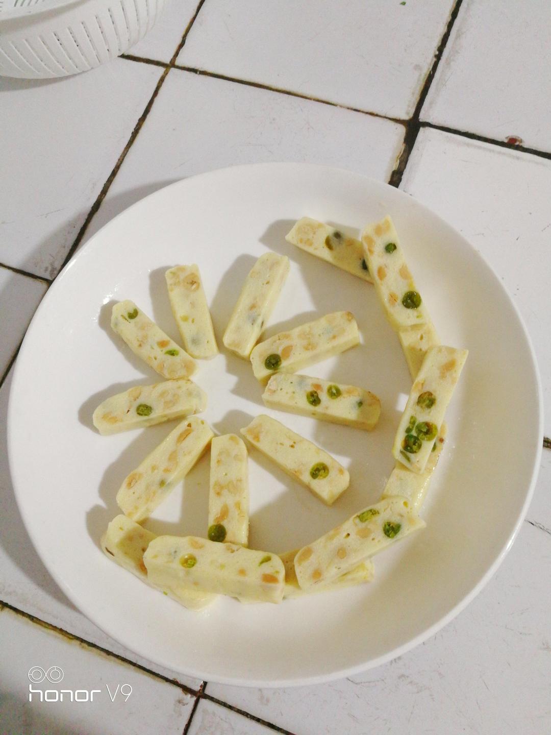 第一次做,熬糖时间比较短,偏软。自己加了青豆,花生用的酒鬼花生,偷了下懒!甜中带点咸,个人比较喜欢。