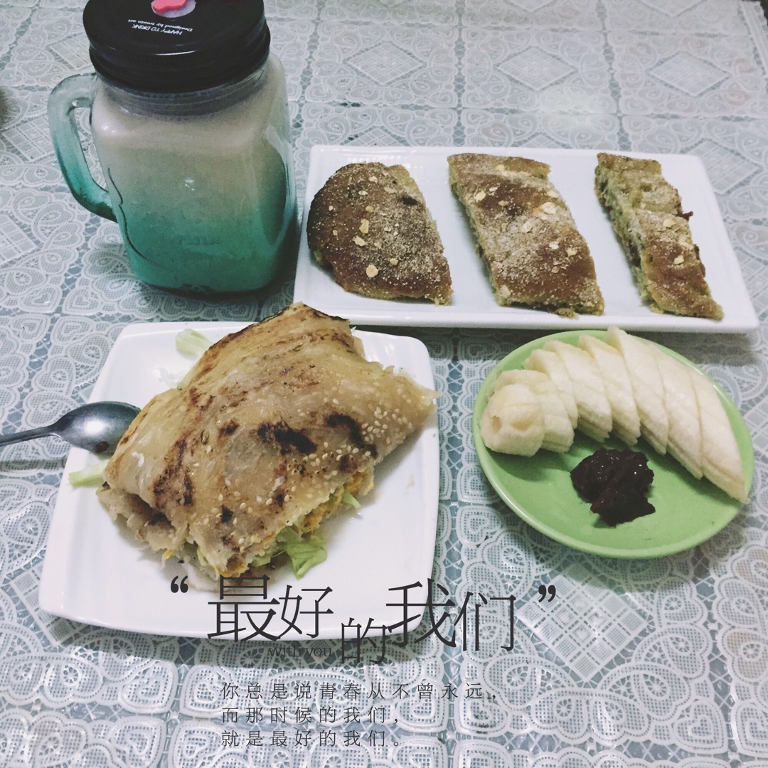 昨天做的麻薯软欧+手抓饼+花生豆桨+水果,717大家都败了些什么……