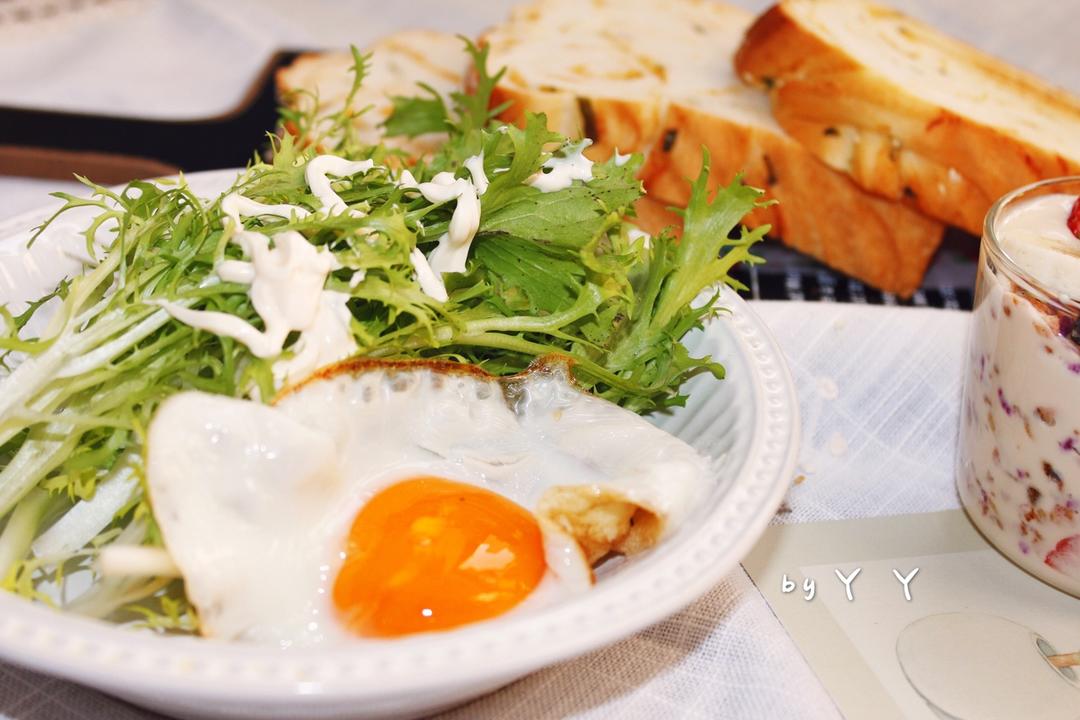 今日份早餐:香葱肉松土司切片➕坚果麦片酸奶➕无油煎蛋➕苦菊[跳跳][跳跳]...