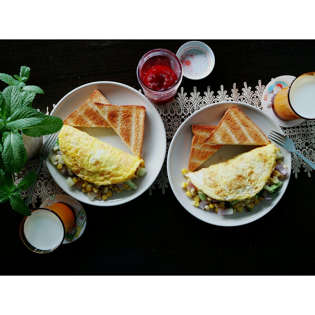 牛奶+素食蛋饼(西蓝花 玉米 洋葱 芝士)+烤土司+草莓🍓果酱