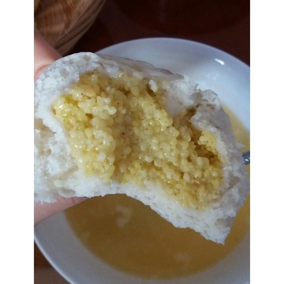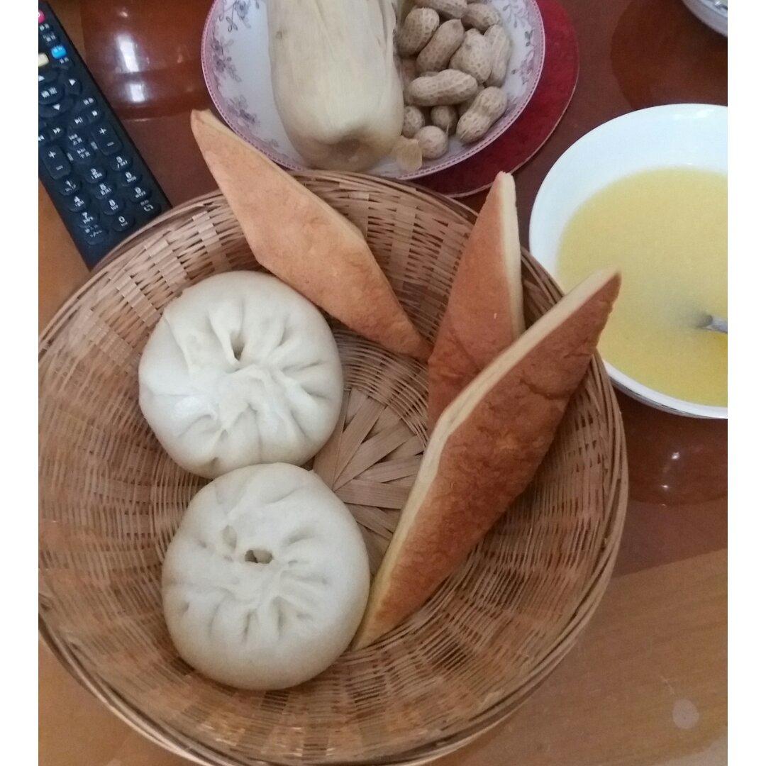 冰糖大黄米包子~玉米面糊糊,煮玉米,鸡蛋。