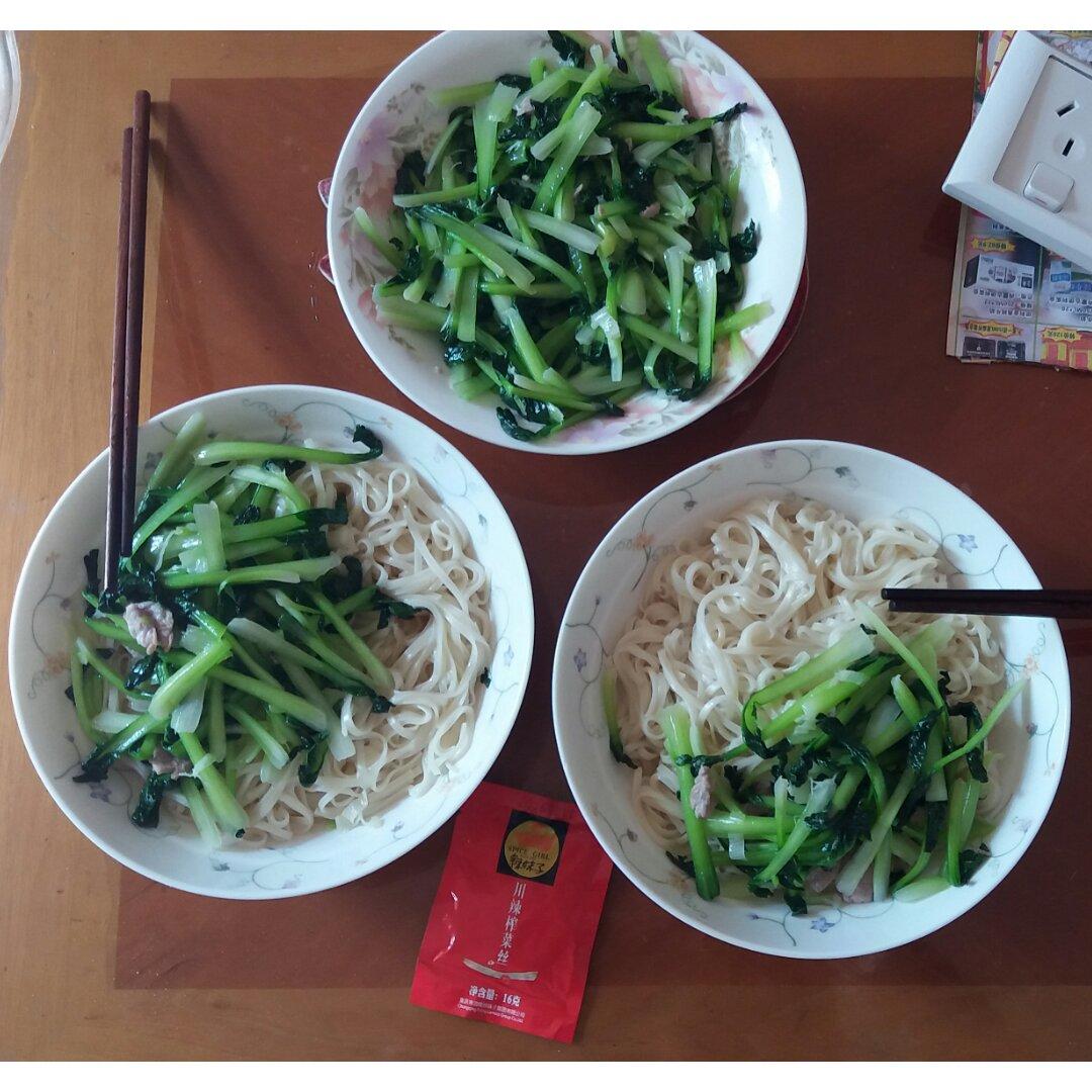 苔古菜猪肉打卤面,再来一包酸辣榨菜~加点白醋和日本酱油拌拌,吃啊~