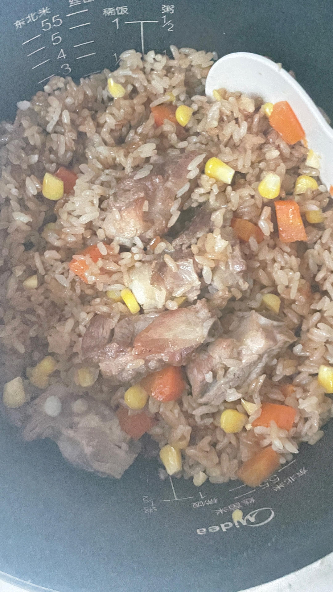 直接放了玉米粒板栗进高压锅,调汁放了豆掰酱,味道还不错,就是汤水有点多,但是不敢煮锅巴,放了调的酱汁黑呼呼的怕焦。#排骨...