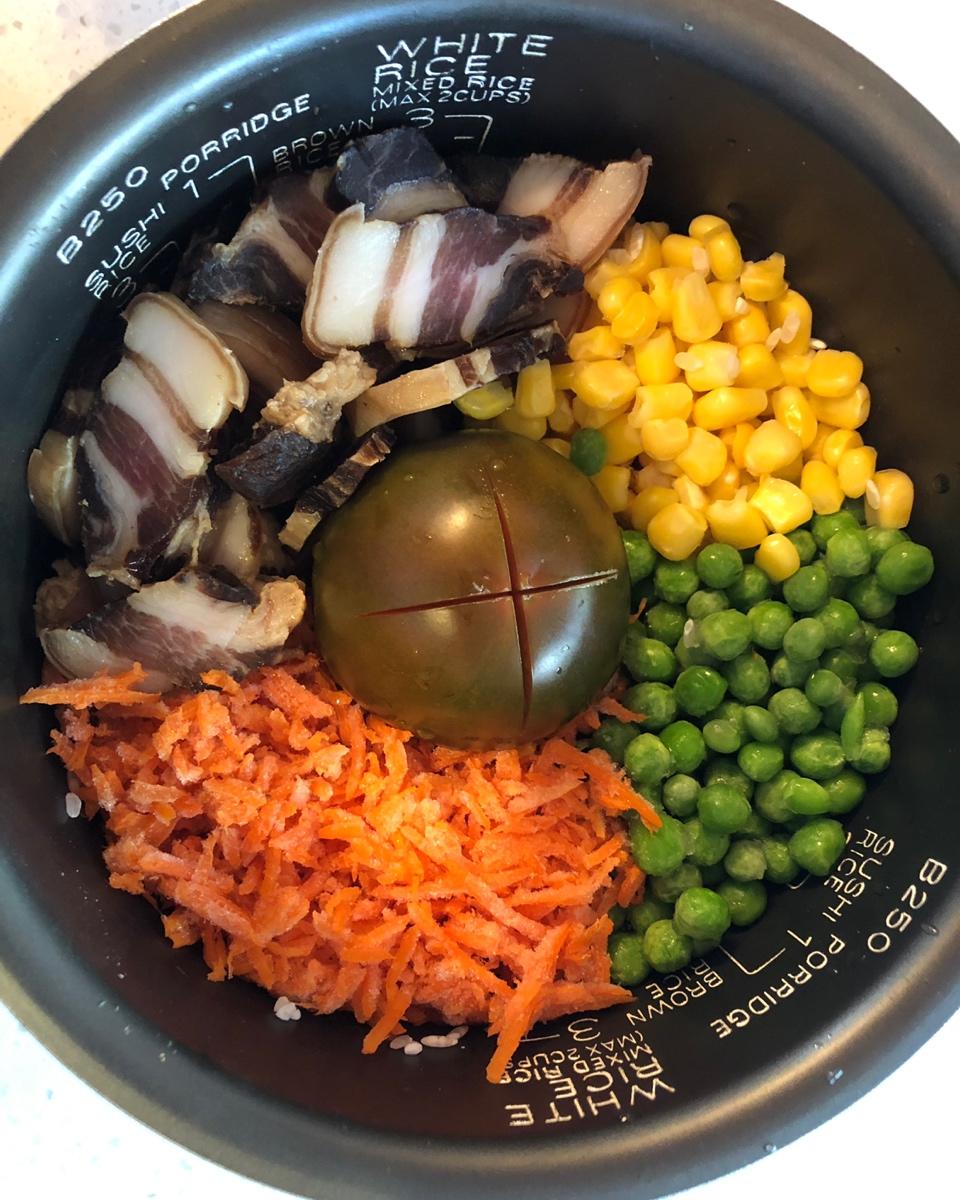 番茄飯內容物:番茄🍅、玉米粒、鴻禧菇、紅蘿蔔🥕、洋蔥、藜麥、培根...