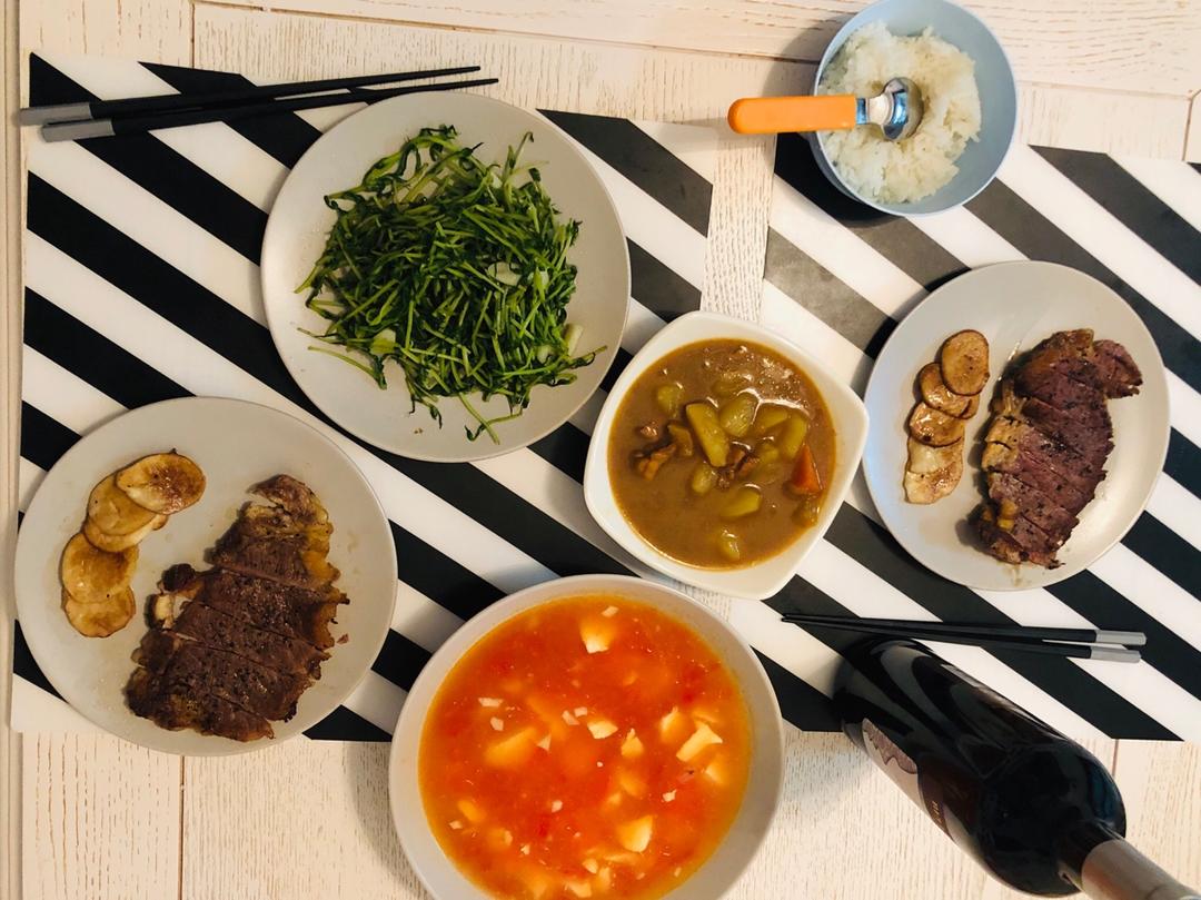 第一次煎牛排就以一个八分熟一个全熟而失败告终…咖喱倒是越煮越好吃了😋
