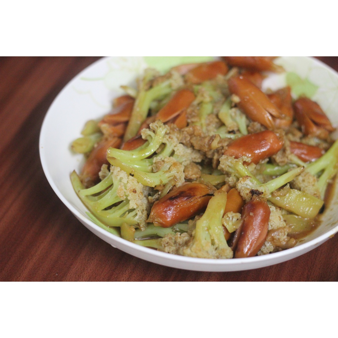 花菜炒QQ肠,室友做哒。其实是从冰箱里翻出啥就一起炒了,味道自然没得说,光盘了。就是焖久了花菜有点软了些。 #早餐•20...