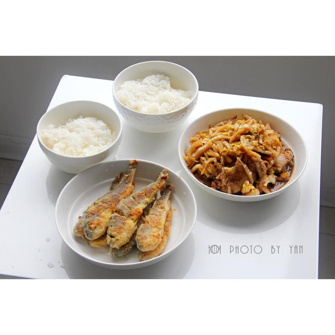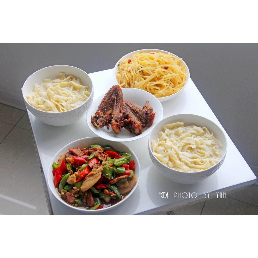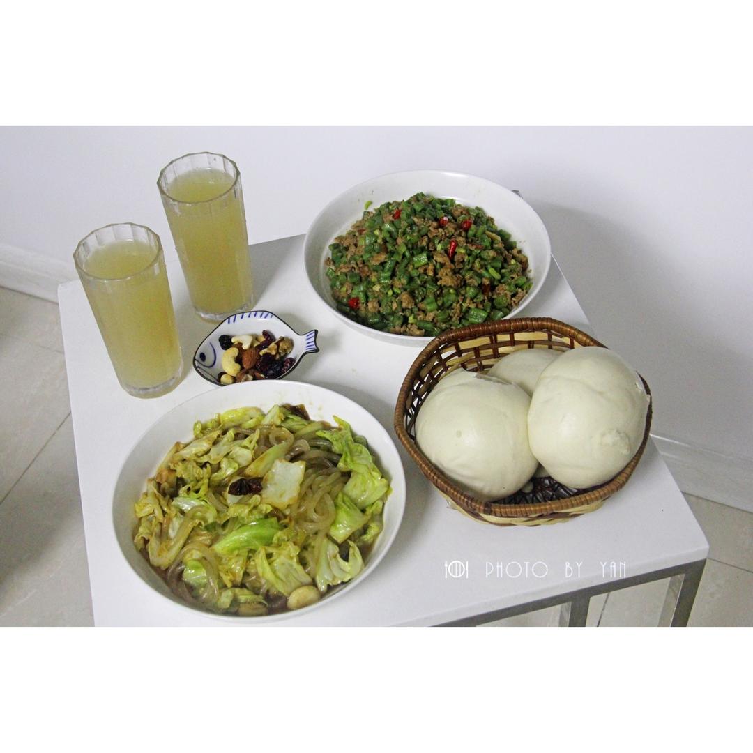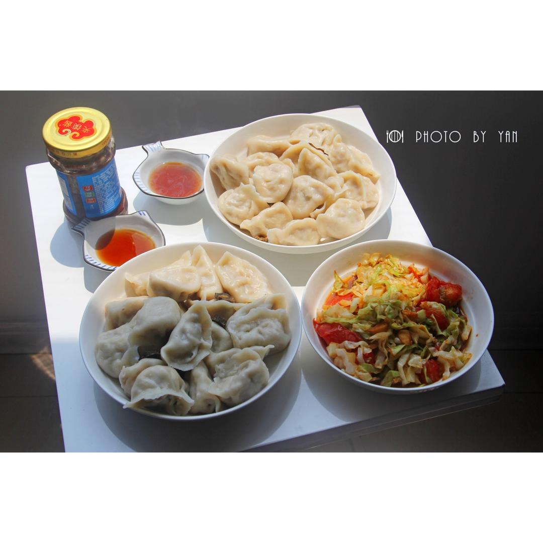 午餐,萝卜肉洋葱肉水饺,西红柿炒甘蓝,香菇肉酱。