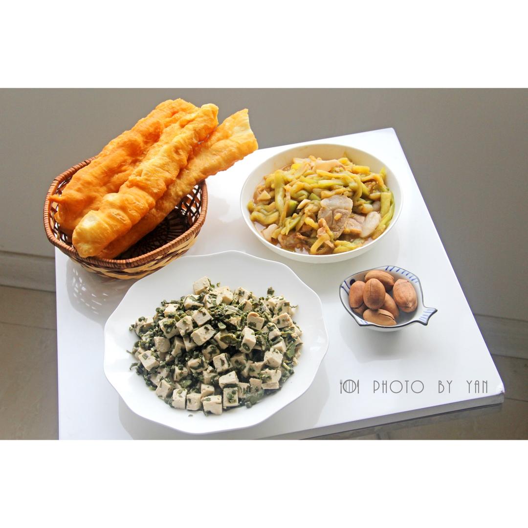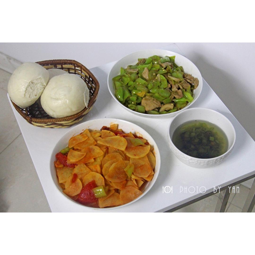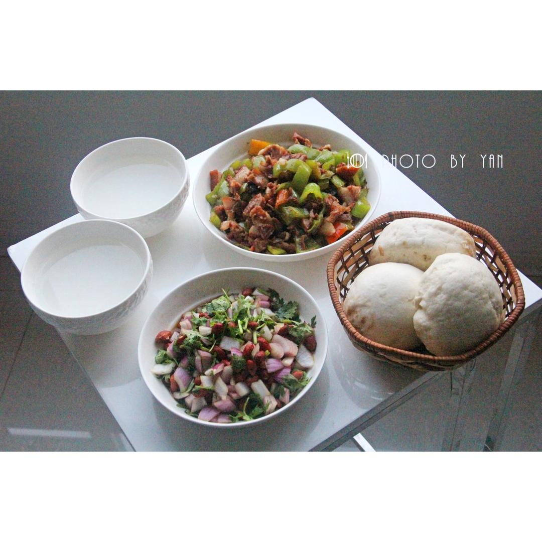 今日晚餐❤️辣椒炒猪头肉,老醋花生,馒头。