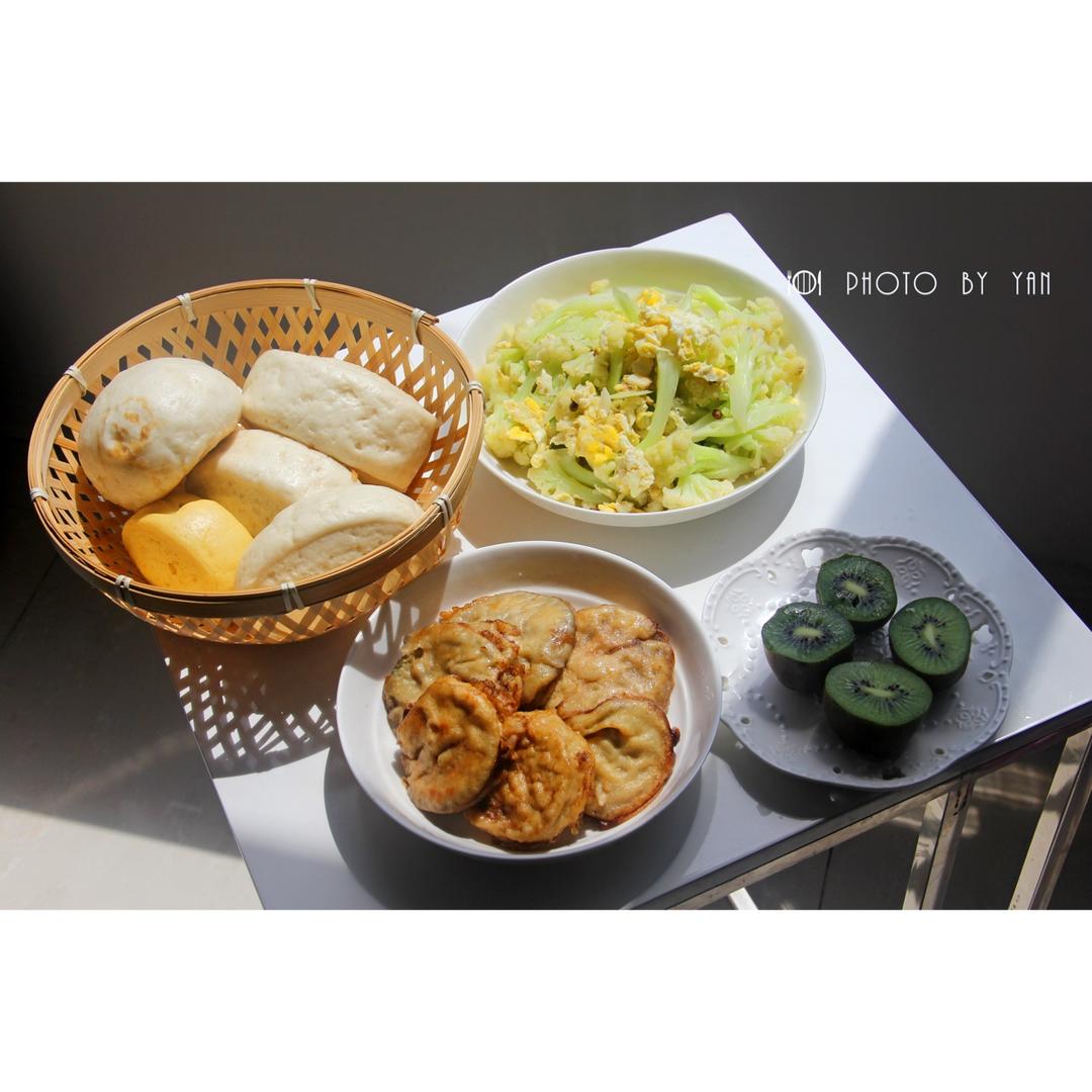 午餐,炸藕盒茄盒,菜花炒蛋,馒头,猕猴桃。