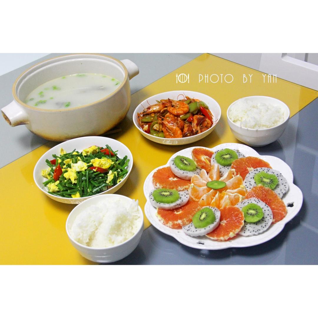 油焖大虾,韭菜苔炒蛋,奶白鲫鱼汤,水果拼盘。
