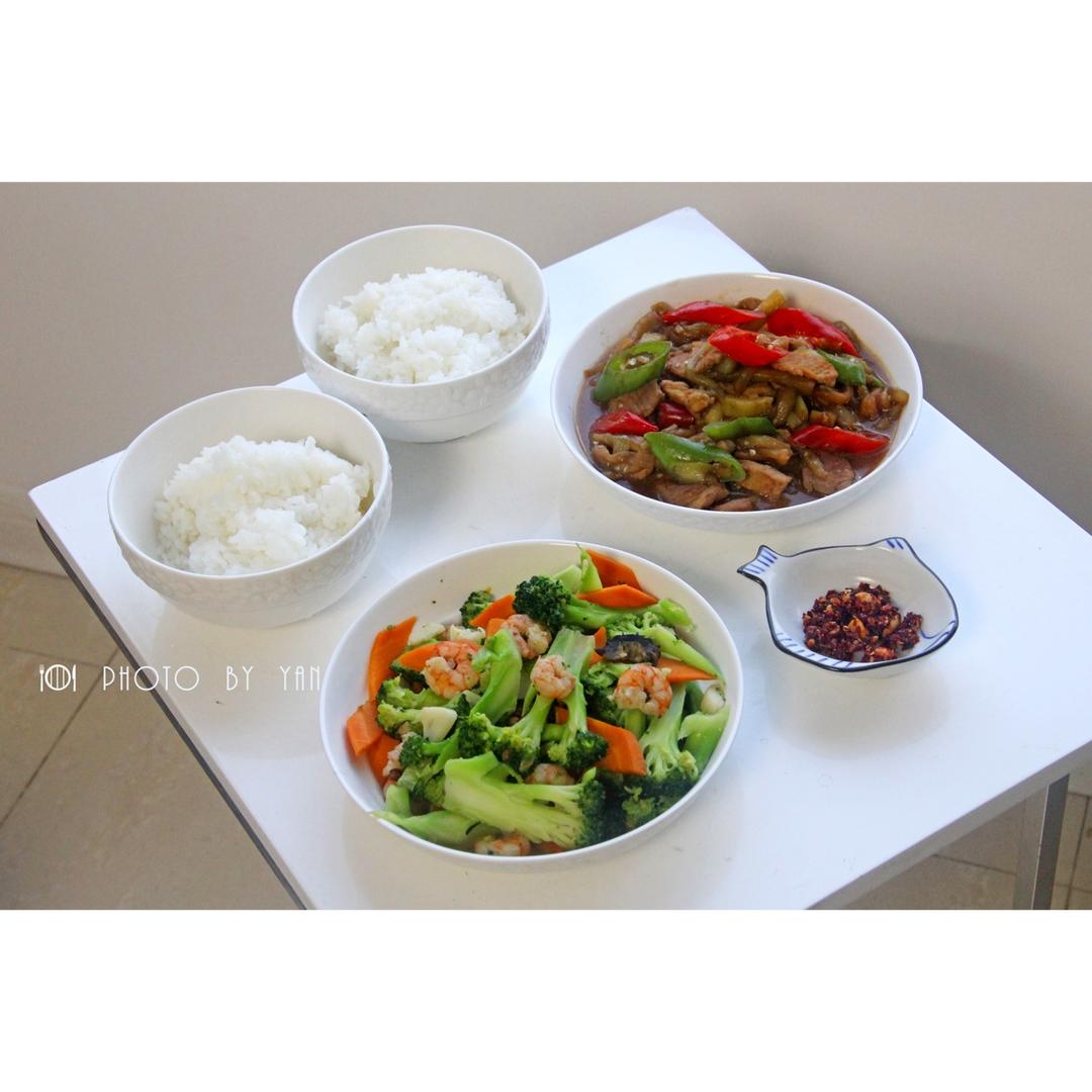 西兰花炒虾仁🍤,辣椒茄子炒肉,米饭。