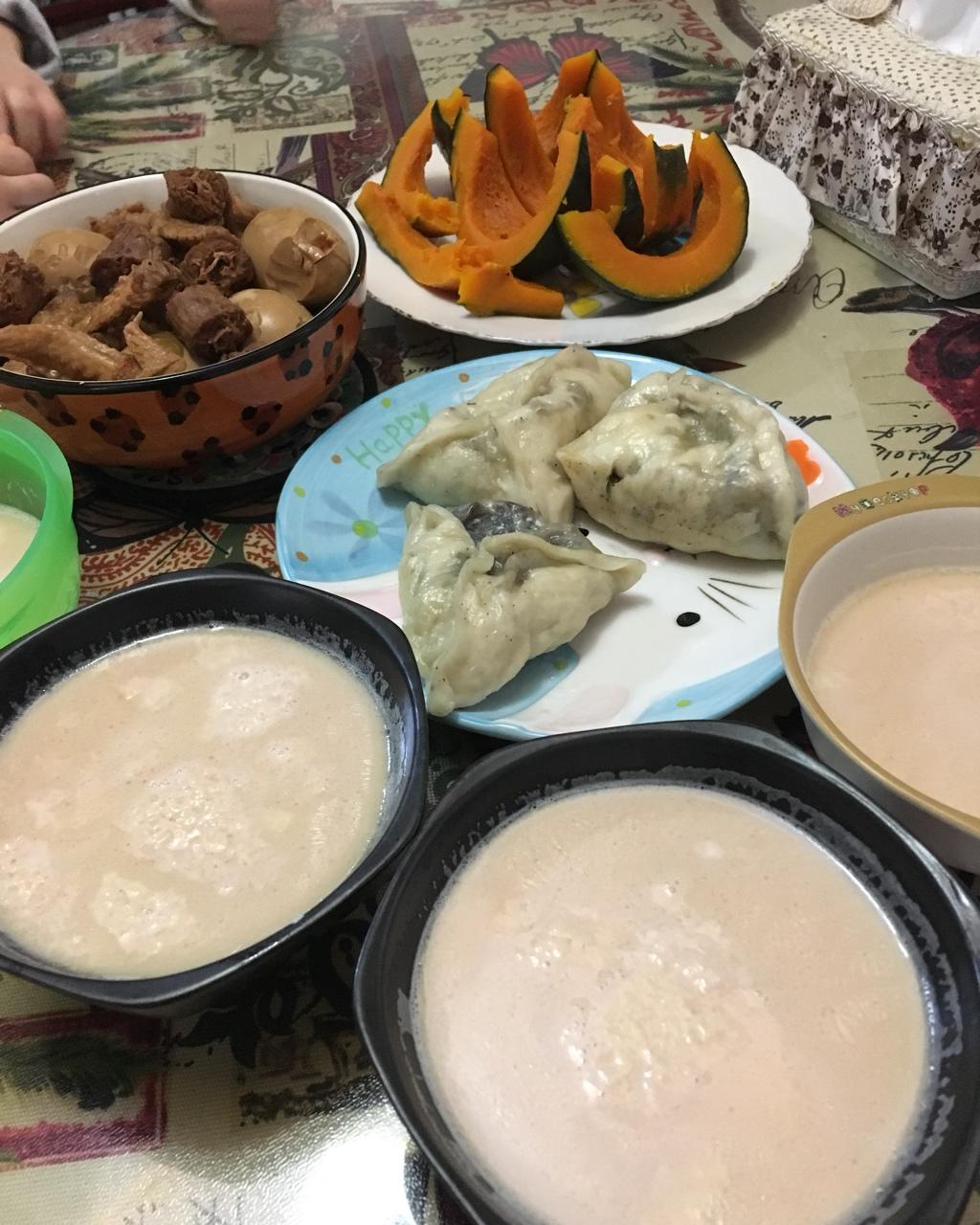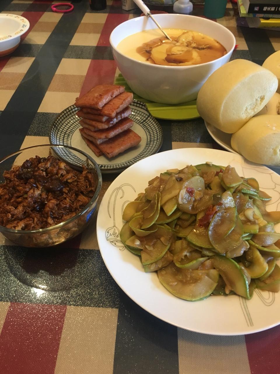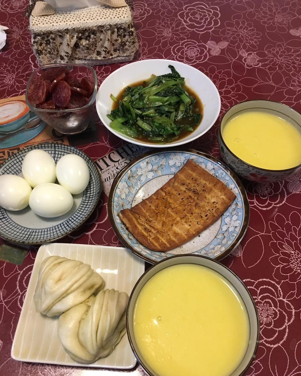 清炒鸡毛菜、大姨自己灌的广式香肠、黑椒煎豆干、水煮蛋~~一个大南瓜蒸熟,放料理机+牛奶打成糊,煮进玉米糊糊里,南瓜牛奶玉...