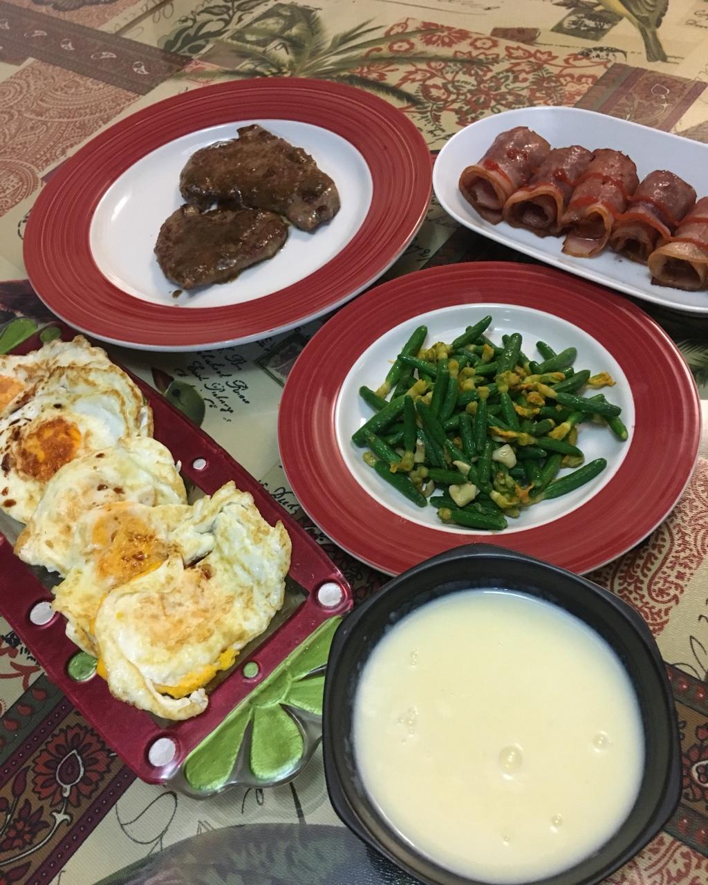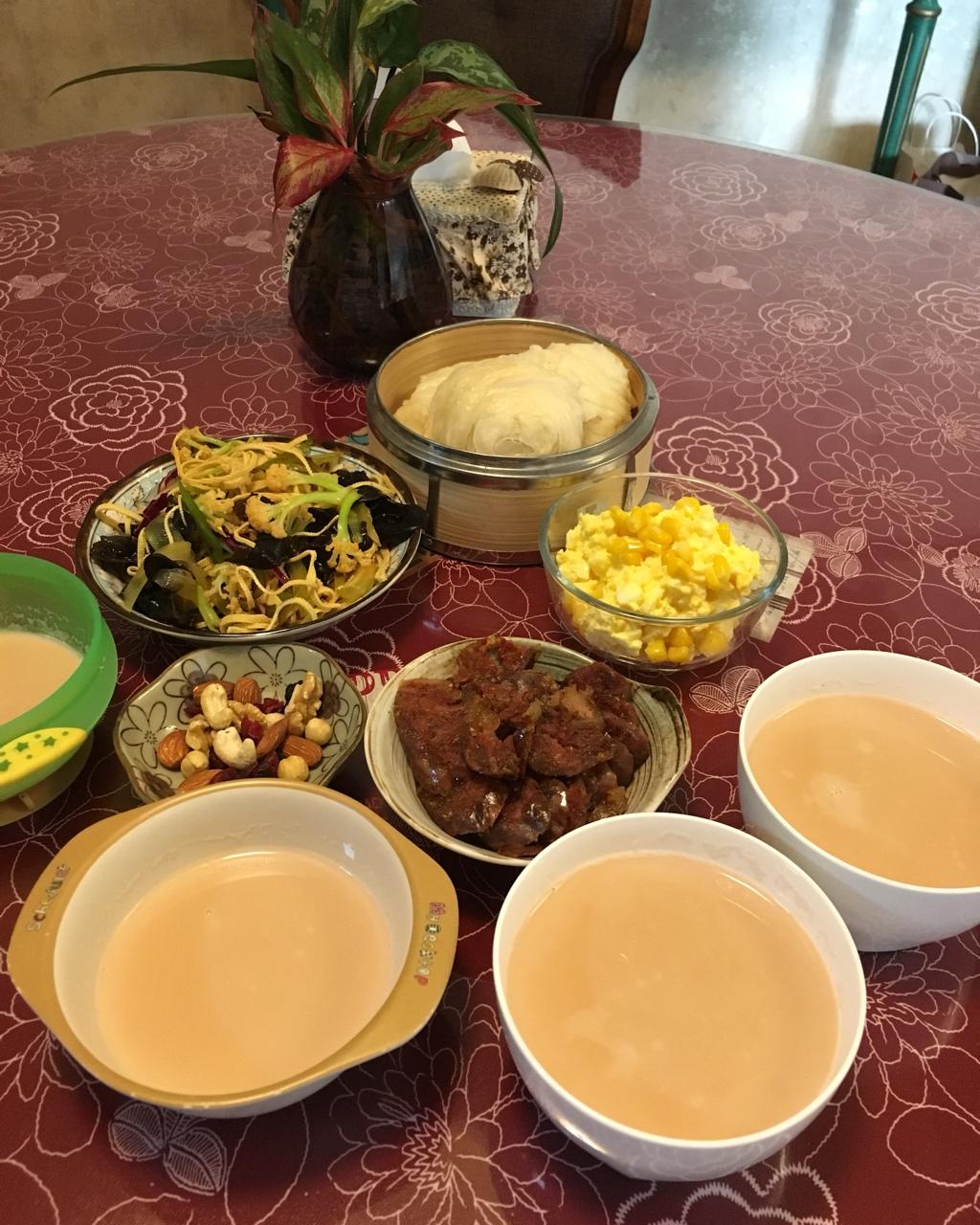 早中餐~~~牛排、豆干、荷兰豆、芦笋、玉米和南瓜泥,主食面包,饮品红枣核桃杂豆奶~~~一周的忙碌工作后,周末早餐是一家人...