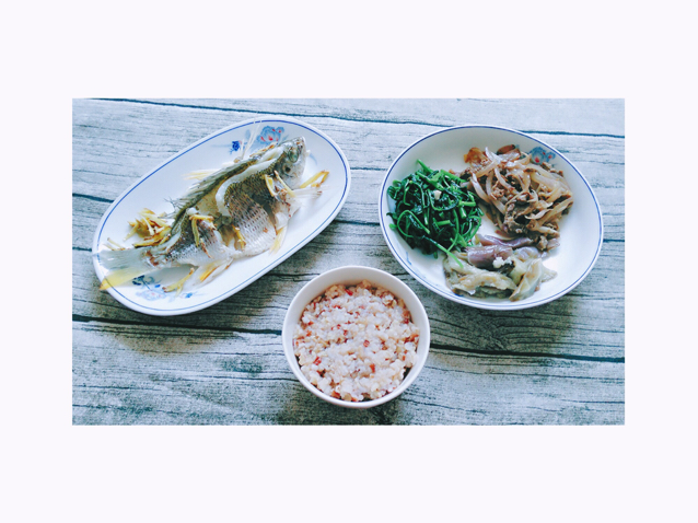 糙米饭水多了快变成糙米粥了hh/ 用橄榄油炒的空心菜 以及 洋葱牛肉/茄子先用的水煮 再用清蒸鱼自己煮出来的...