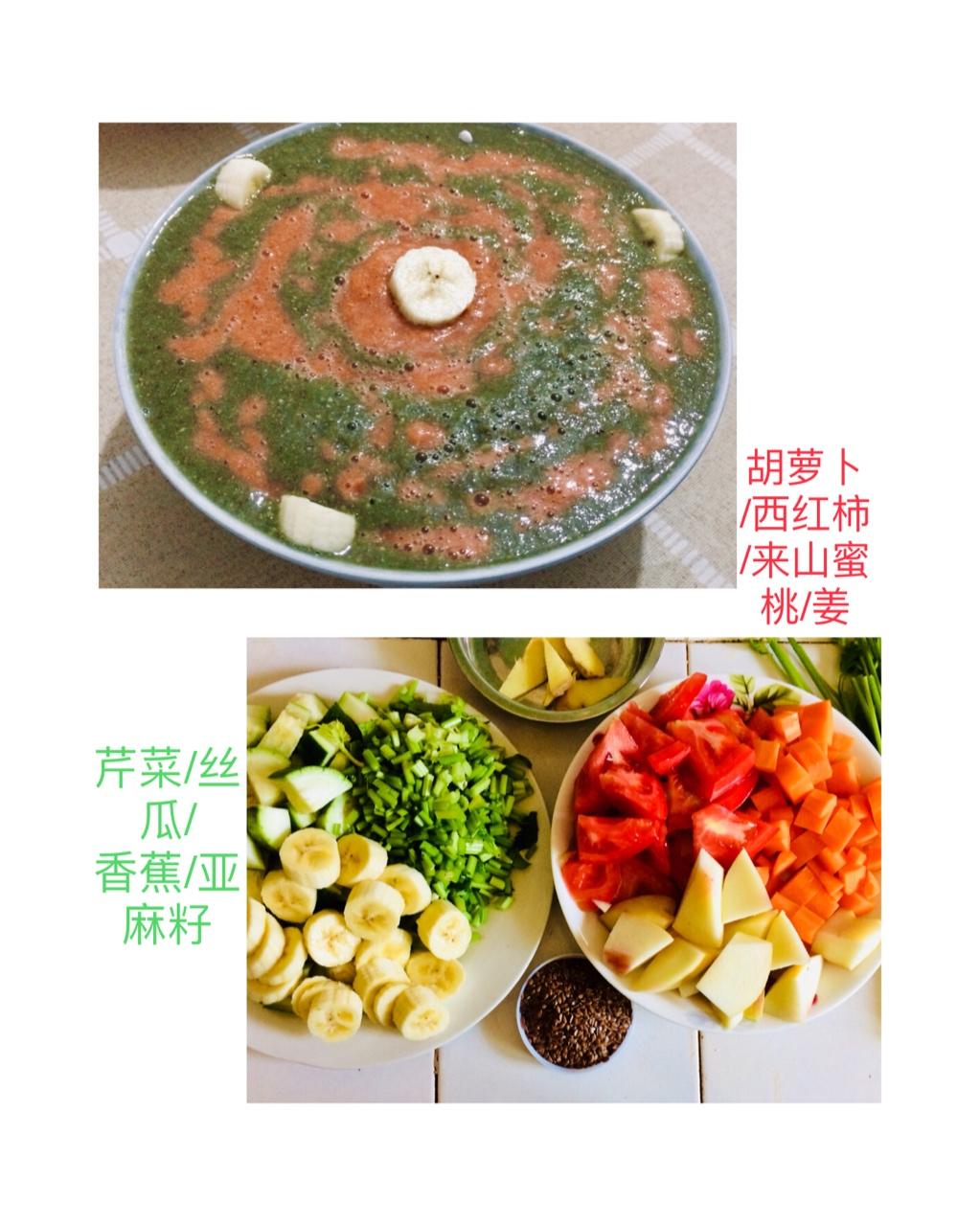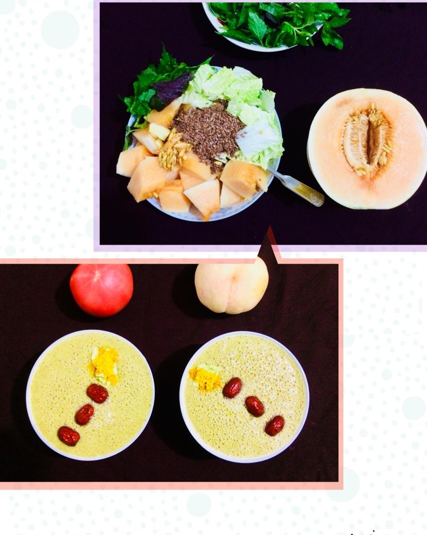 黄心香瓜/白菜/少量藿香薄荷紫苏叶/亚麻籽/姜黄粉 好甜好喝😘感恩万物!