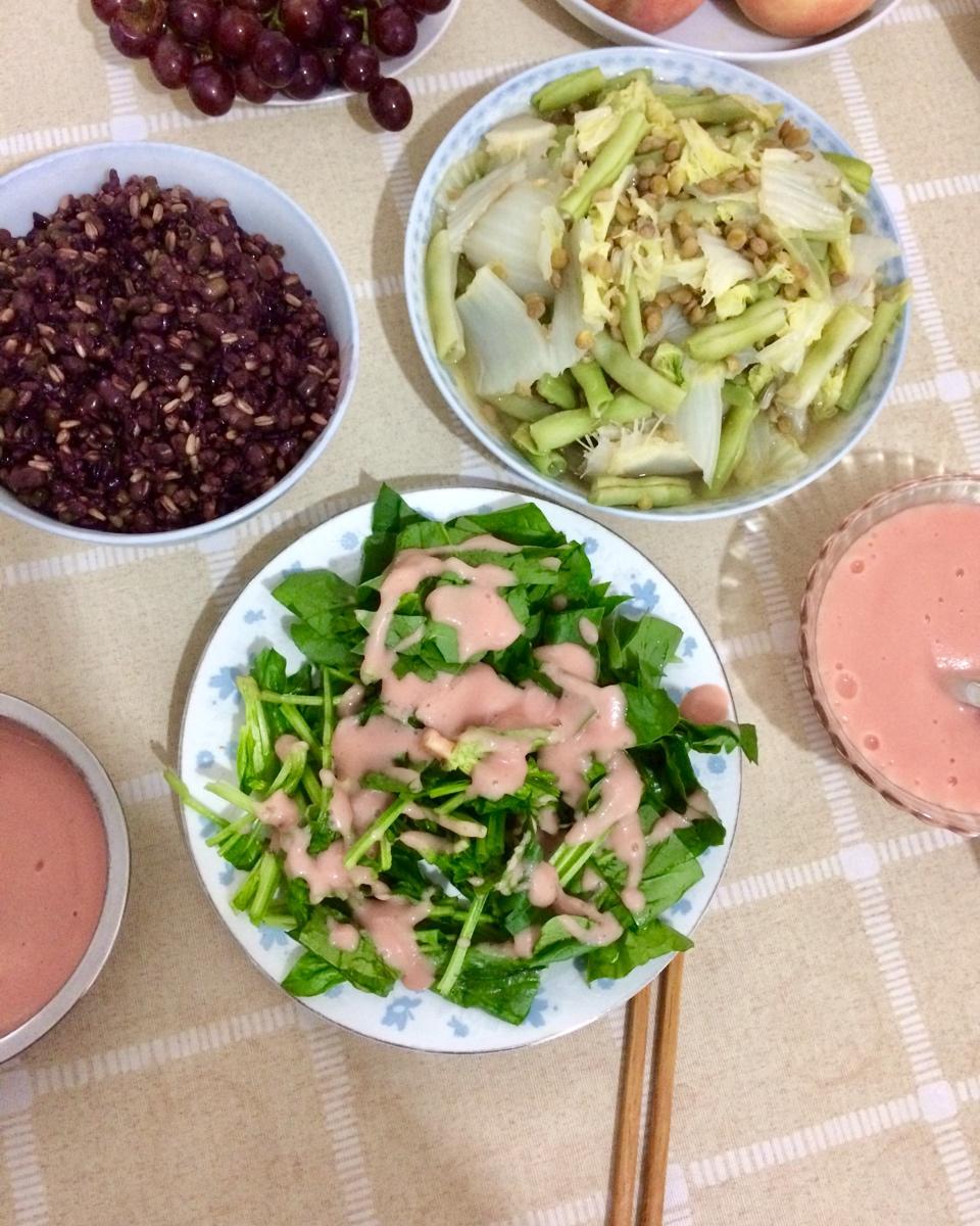 小扁豆炖豆角白菜/山药酱拌菠菜/红豆绿豆黑米燕麦米蒸饭……感恩遇见🌹