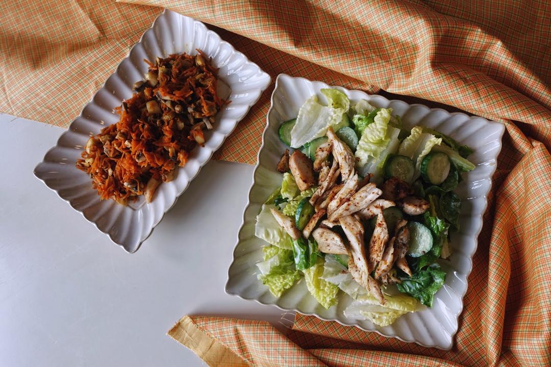 -🥕胡萝卜炒蘑菇丁,只放了橄榄油、鸡精、黑胡椒,简直人间美味。