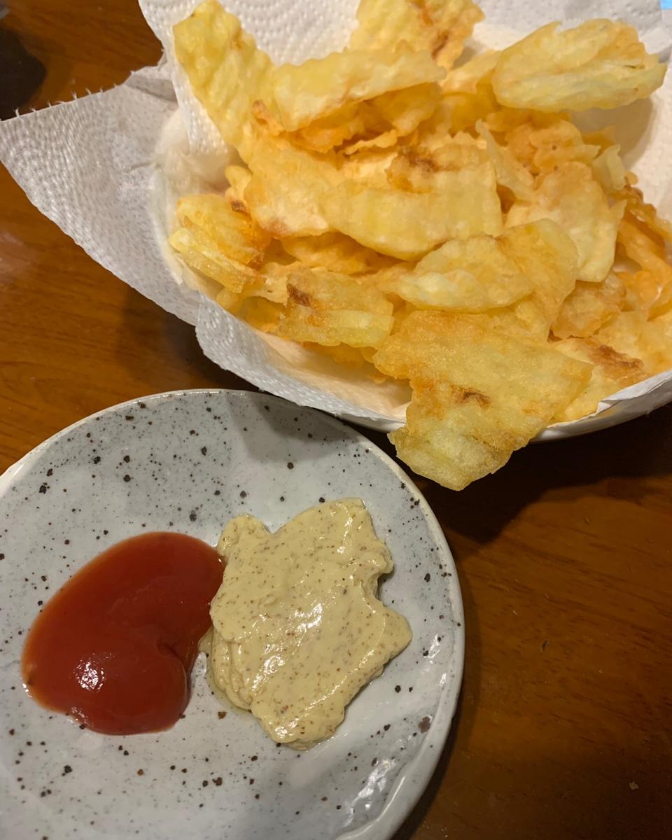 小高姐的华夫薯片,切残了😂不过是真的好吃😋45ml白醋泡3分钟,135度下锅炸第一次,捞出,继续加温到195度再次下锅炸...
