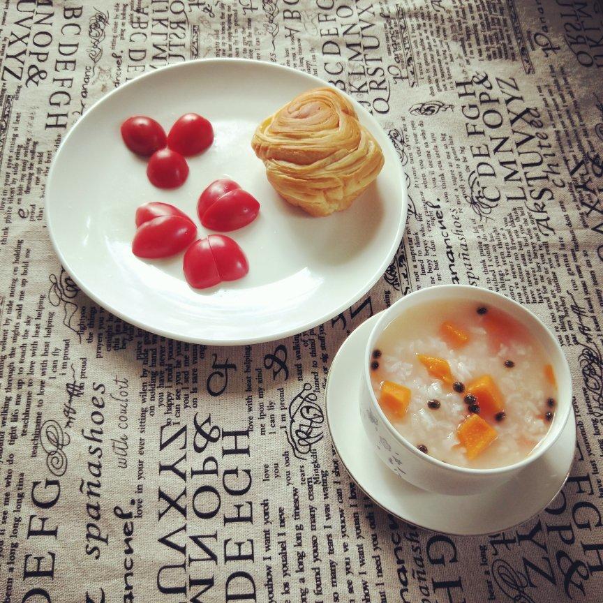 早餐有木瓜粥,圣女果,手撕面包