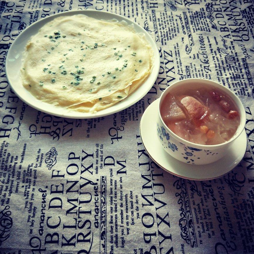 银耳炖雪梨,鸡蛋饼