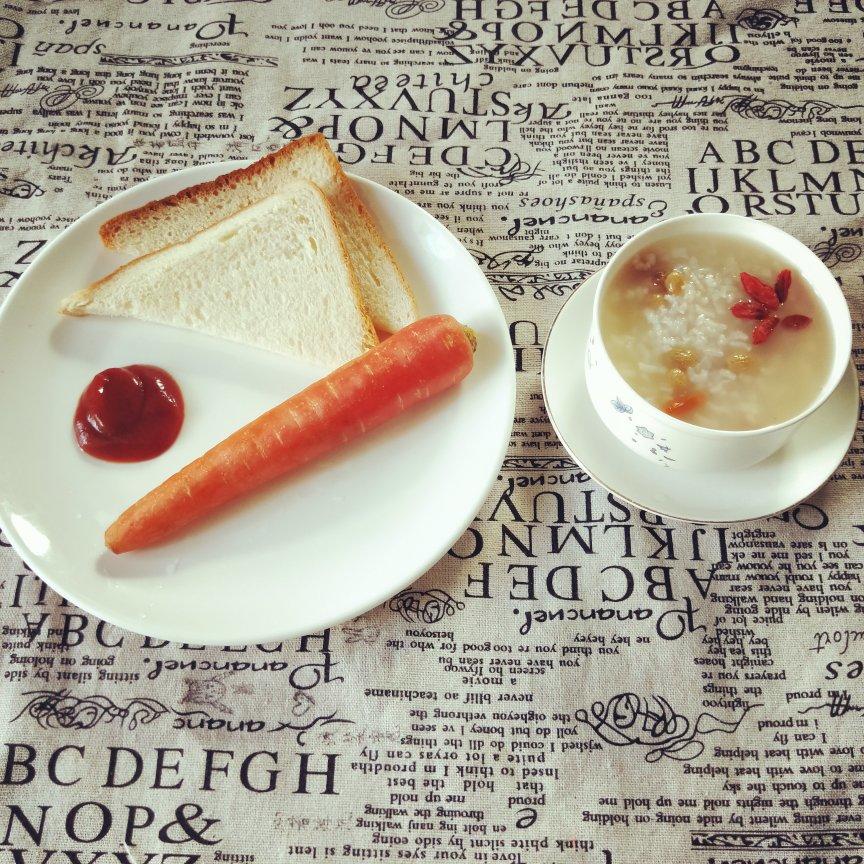 早餐有葡萄干枸杞粥,土司片,水果胡萝卜