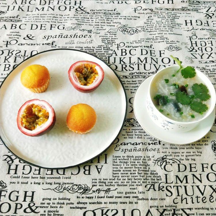 早餐有皮蛋瘦肉粥,小蛋糕,百香果