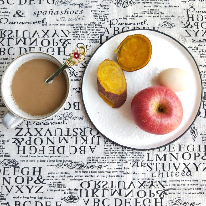 早餐有咖啡☕,苹果🍎,地瓜,鸡蛋。