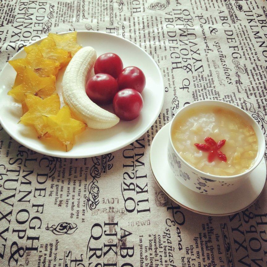 早餐有苹果枸杞粥,杨桃,香蕉,李...