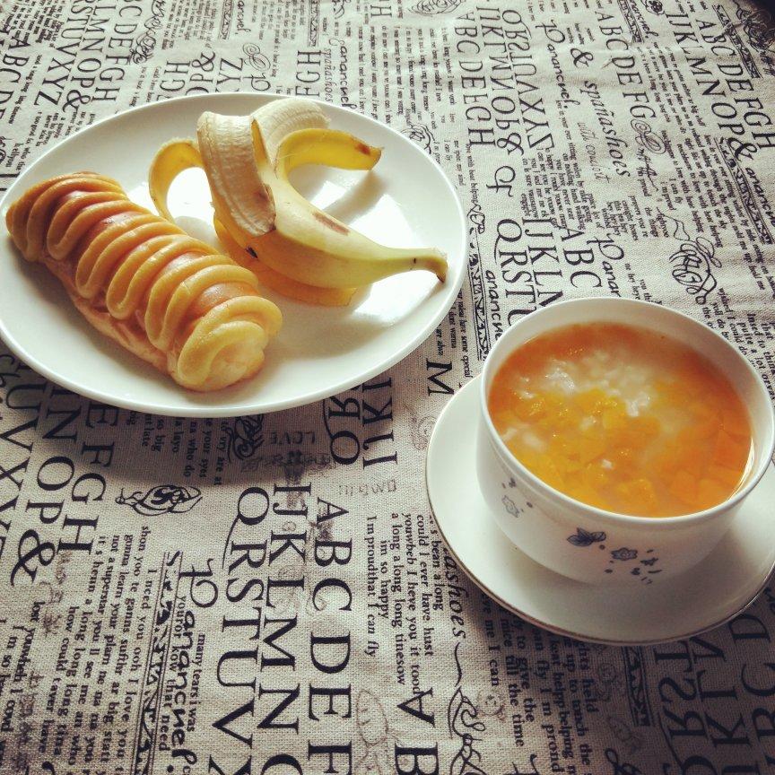 早餐有 南瓜粥 香蕉 毛毛虫奶酪条