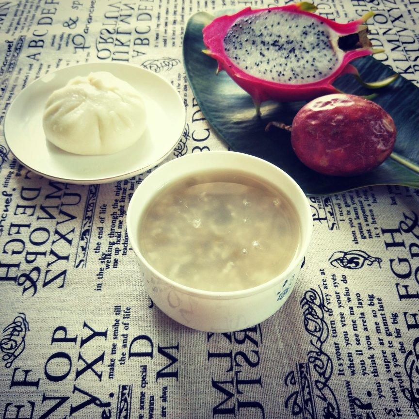 早餐有肉包,绿豆粥,火龙果,百香果。