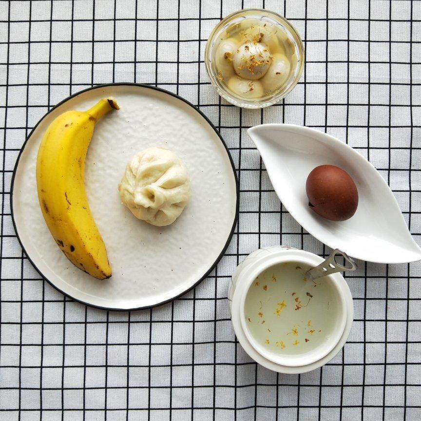 早餐有 白米粥 黑芝麻汤圆 茶叶蛋 肉包 香蕉。