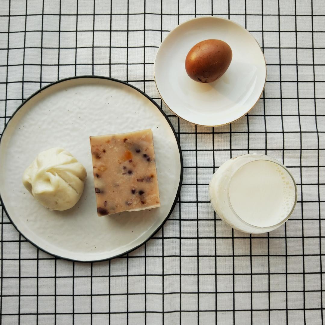 早餐有 牛奶 梅干菜包 茶叶蛋 崇明糕