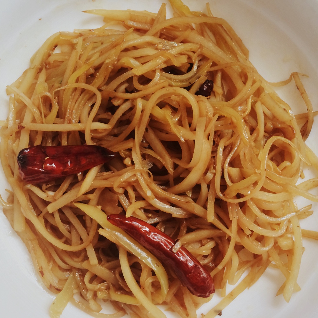 土豆切片泡在碗里两天,尖椒是婆婆种的,很辣,所以不戴手套切实在是个错误。味道和口感都很完美,最后撒了一点麻油。 #午餐•...