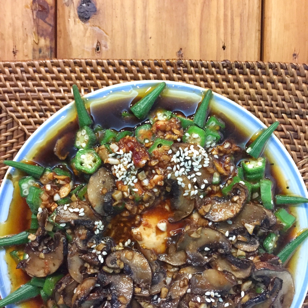 油淋秋葵嫩豆腐-另自己加了冰箱里昨天剩下的大蘑菇,干辣椒没有就换成了韩式辣酱,味道也是不错的呢! #晚餐•2016年7月...