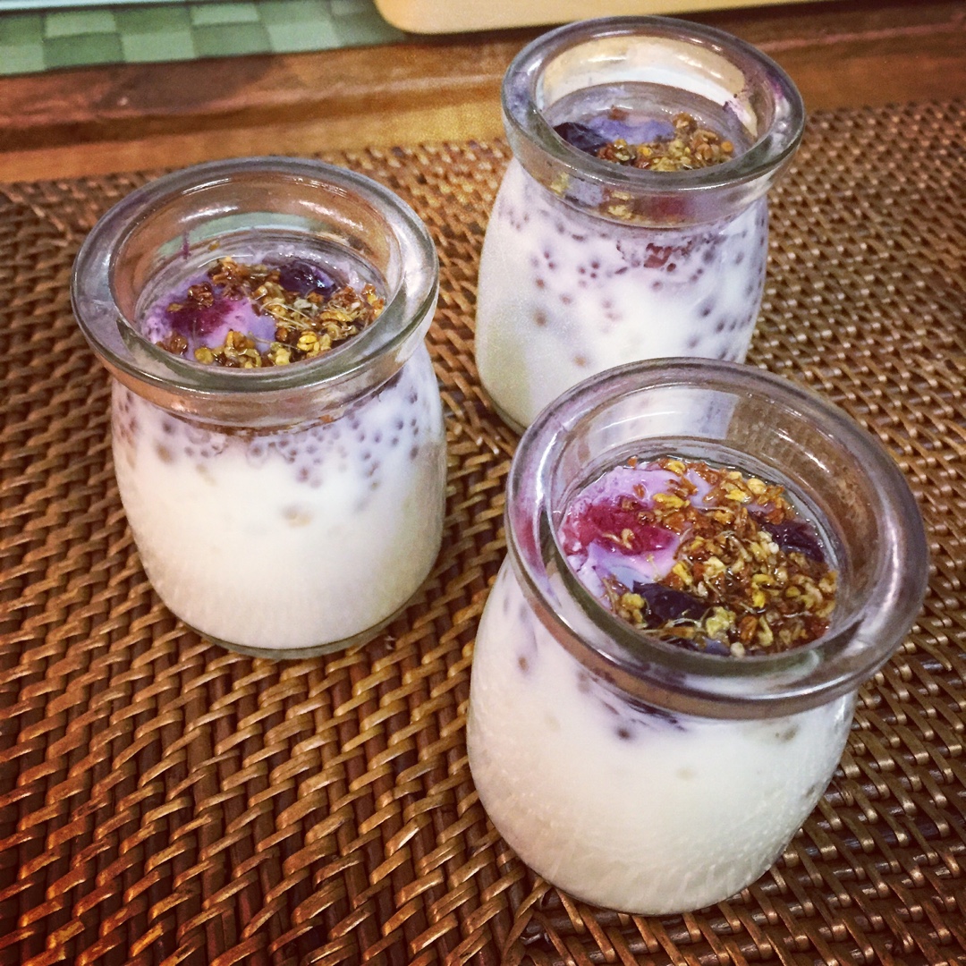 蜂蜜桂花炖奶,外加覆盆子和蓝莓