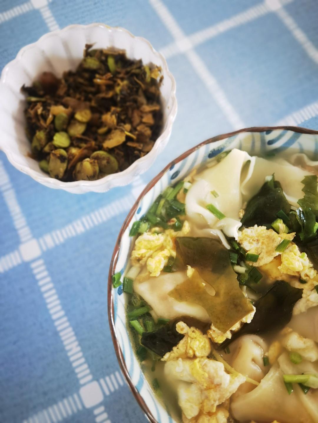裙带菜煮大馄饨,盐菜炒蚕豆